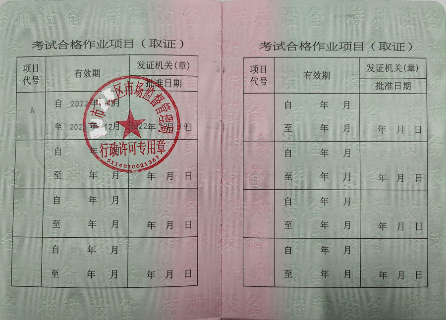特種安全設備管理A,(電梯管理,鍋爐壓力容器管道管理,起重機械管理,場(廠)內專用機動車輛管理,)起重機指揮Q1,起重司機(限門座式起重機)Q2,起重司機(限橋式起重機)Q2,起重司機(限門式起重機)Q2,起重司機(限纜索式起重機)Q2,起重司機(限塔式起重機)Q2,起重司機(限流動式起重機)Q2,起重司機(限升降機)Q2,叉車司機N1,觀光和觀光列出司機N2,電梯維修T,鍋爐壓力容器壓力管道管理,電梯管理,起重機械管理,場(廠)內專用機動車輛管理,工業鍋爐司爐,電站鍋爐司爐,鍋爐水處理,快開門式壓力容器操作,移動式壓力容器充裝,氣瓶充裝,金屬焊接操作(壓力焊PE焊),非金屬焊接操作(壓力容器焊),食品檢驗員,化學檢驗員,農產品檢驗員(4年一審,需要到期前3個月進行)